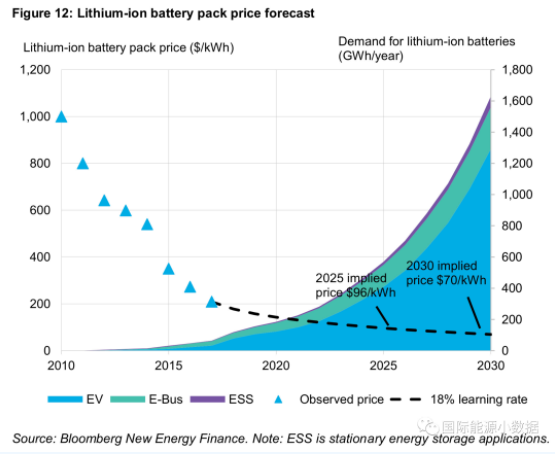 BNEF預(yù)測,2025年鋰電池組的平均成本可降至96美元/千瓦時(shí);2030年將至70美元/千瓦時(shí)。到2030年,全球?qū)︿囯姵亟M的需求可達(dá)16億千瓦時(shí),其中80%將用于電動汽車,其余主要用于電動大巴車。
