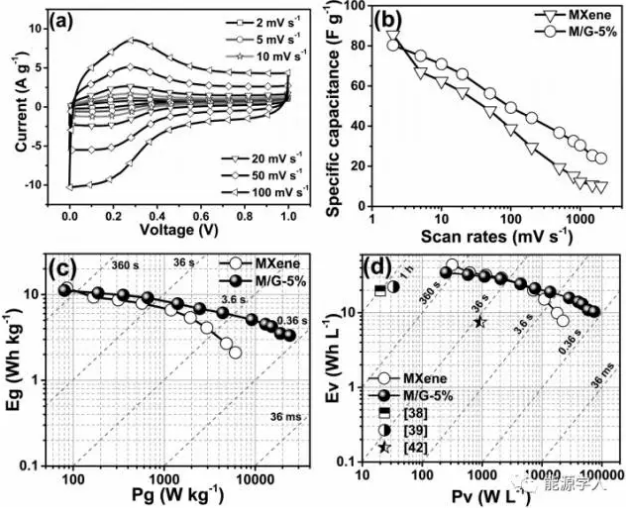 圖3MXene和M/G-5%電極在對稱超級電容器中不同掃速下的(a)CV圖;(b)質量比電容圖;MXene和M/G-5%電極在對稱超級電容器中(c)質量;(d)體積能量和功率密度圖。