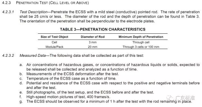 國外動力電池針刺標準主要來源于SAEJ2464《ElectricVehicleBatteryAbuseTesting》,測試標準如下: